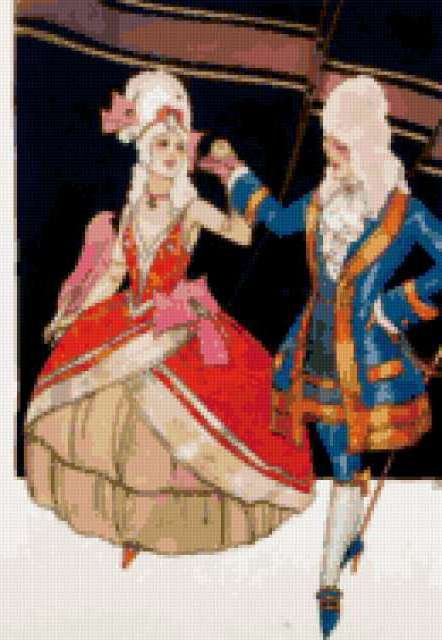 Ориентировочно так, схема вышивки «На балу», созданная автором Rin385, будет выглядеть при отшиве на канве. Размер данной вышивки равен 130x188 крестов, при этом используется 58 цветов. Ключевые слова, по которым можно найти эту схему: девушка, женщина, картина, разное. Также, вы можете взглянуть на оригинальную картинку, соответствующую данной схеме вышивки.