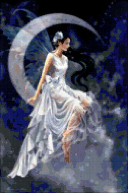 Ориентировочно так, схема вышивки «На луне», созданная автором allllla, будет выглядеть при отшиве на канве. Размер данной вышивки равен 126x190 крестов, при этом используется 52 цветов. Ключевые слова, по которым можно найти эту схему: на луне, она, девушка, хаед, девушки, портрет, женские образы, картина, фентези. Также, вы можете взглянуть на оригинальную картинку, соответствующую данной схеме вышивки.