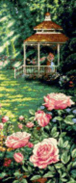 Ориентировочно так, схема вышивки «Найденный рай», созданная автором 13197, будет выглядеть при отшиве на канве. Размер данной вышивки равен 79x190 крестов, при этом используется 68 цветов. Ключевые слова, по которым можно найти эту схему: цветы, розы, сад, беседка, лето, любовь. Также, вы можете взглянуть на оригинальную картинку, соответствующую данной схеме вышивки.