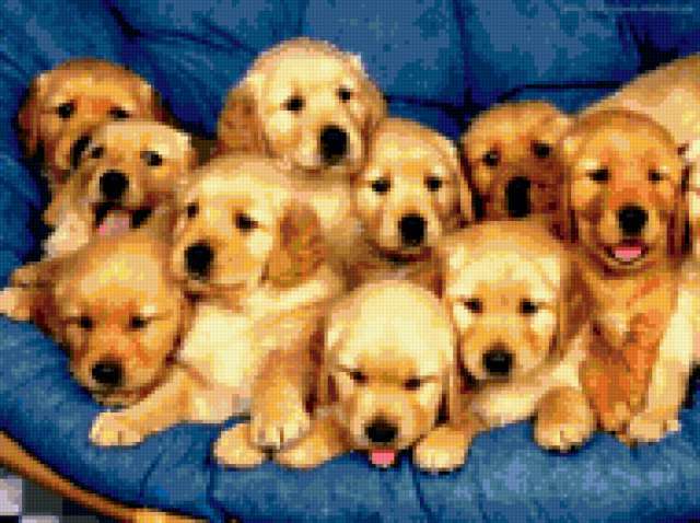 Ориентировочно так, схема вышивки «Нас много...», созданная автором xeufq21, будет выглядеть при отшиве на канве. Размер данной вышивки равен 190x142 крестов, при этом используется 68 цветов. Ключевые слова, по которым можно найти эту схему: щенок, собака, животные. Также, вы можете взглянуть на оригинальную картинку, соответствующую данной схеме вышивки.