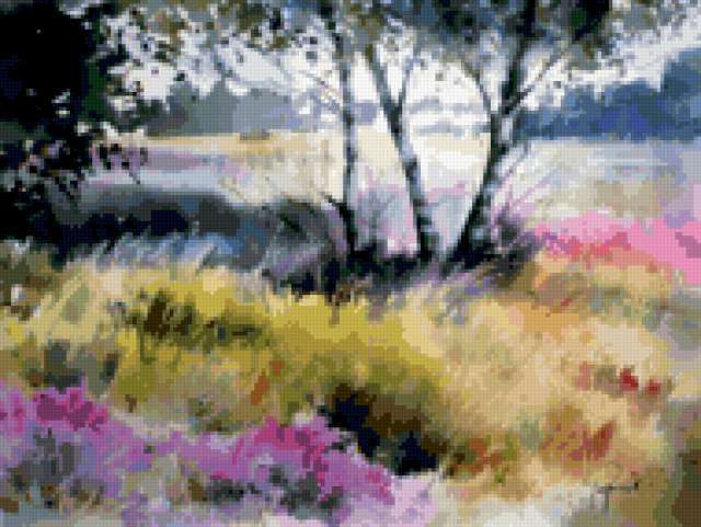 Ориентировочно так, схема вышивки «Наступает осень», созданная автором Svetla_Nochka, будет выглядеть при отшиве на канве. Размер данной вышивки равен 190x143 крестов, при этом используется 88 цветов. Ключевые слова, по которым можно найти эту схему: живопись, осень, природа, погода, лес, красота, пейзаж, поле, травка, трава. Также, вы можете взглянуть на оригинальную картинку, соответствующую данной схеме вышивки.
