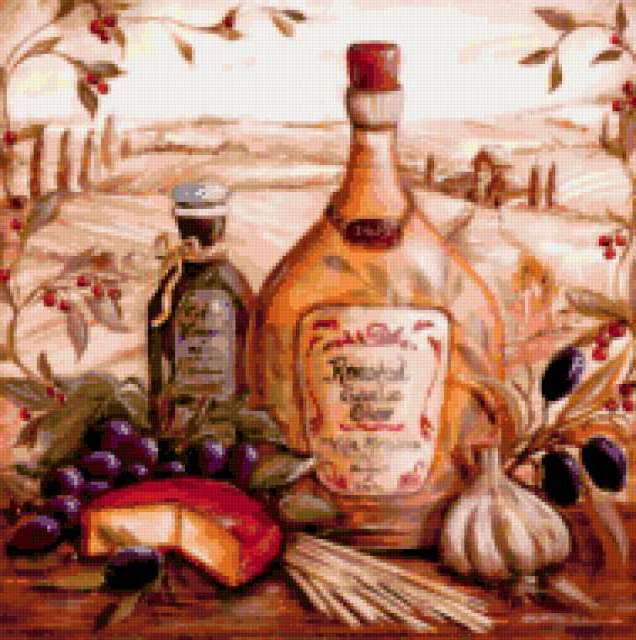 Ориентировочно так, схема вышивки «Натюрморт из Тоскании», созданная автором julia78, будет выглядеть при отшиве на канве. Размер данной вышивки равен 189x190 крестов, при этом используется 74 цветов. Ключевые слова, по которым можно найти эту схему: натюрморт, еда, тоскания. Также, вы можете взглянуть на оригинальную картинку, соответствующую данной схеме вышивки.