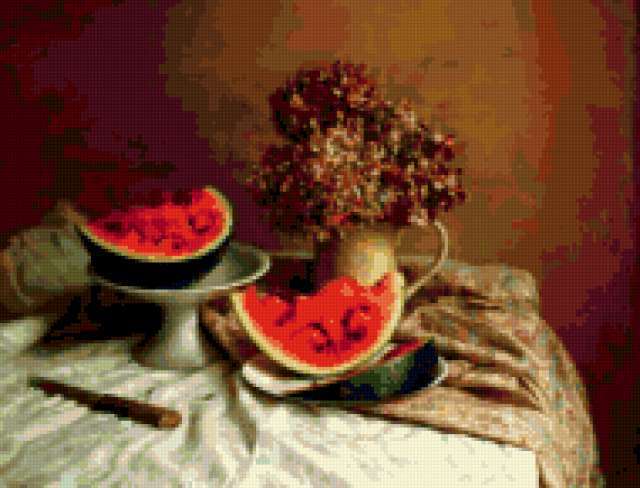 Ориентировочно так, схема вышивки «Натюрморт с арбузом», созданная автором alla040588, будет выглядеть при отшиве на канве. Размер данной вышивки равен 190x145 крестов, при этом используется 65 цветов. Ключевые слова, по которым можно найти эту схему: натюрморт. Также, вы можете взглянуть на оригинальную картинку, соответствующую данной схеме вышивки.