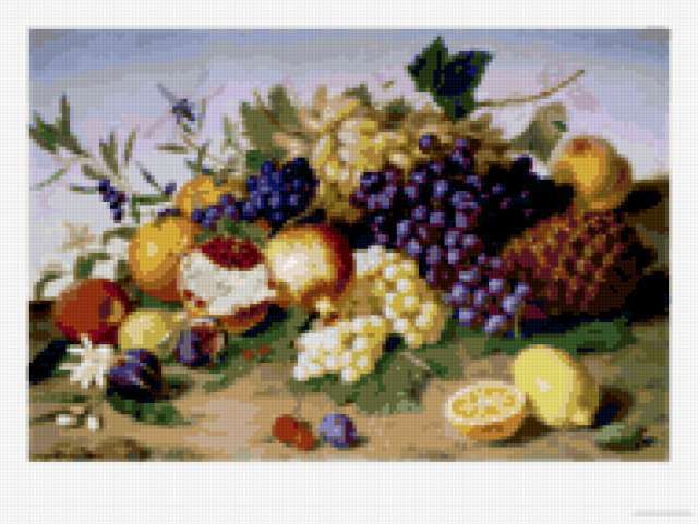 Ориентировочно так, схема вышивки «Натюрморт с виноградом », созданная автором eldi_22, будет выглядеть при отшиве на канве. Размер данной вышивки равен 190x143 крестов, при этом используется 70 цветов. Ключевые слова, по которым можно найти эту схему: натюрморт, фрукты, виноград, картина, живопись, для кухни. Также, вы можете взглянуть на оригинальную картинку, соответствующую данной схеме вышивки.