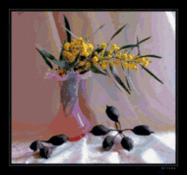 Ориентировочно так, схема вышивки «Натюрморт с мимозой», созданная автором avzv, будет выглядеть при отшиве на канве. Размер данной вышивки равен 190x178 крестов, при этом используется 56 цветов. Ключевые слова, по которым можно найти эту схему: картина, натюрморт, флора, цветы, букет, ваза, мимоза. Также, вы можете взглянуть на оригинальную картинку, соответствующую данной схеме вышивки.
