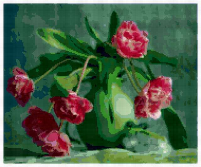 Ориентировочно так, схема вышивки «Натюрморт с пионами», созданная автором avzv, будет выглядеть при отшиве на канве. Размер данной вышивки равен 190x158 крестов, при этом используется 55 цветов. Ключевые слова, по которым можно найти эту схему: картина, натюрморт, флора, цветы, букет, ваза, кувшин, пионы. Также, вы можете взглянуть на оригинальную картинку, соответствующую данной схеме вышивки.