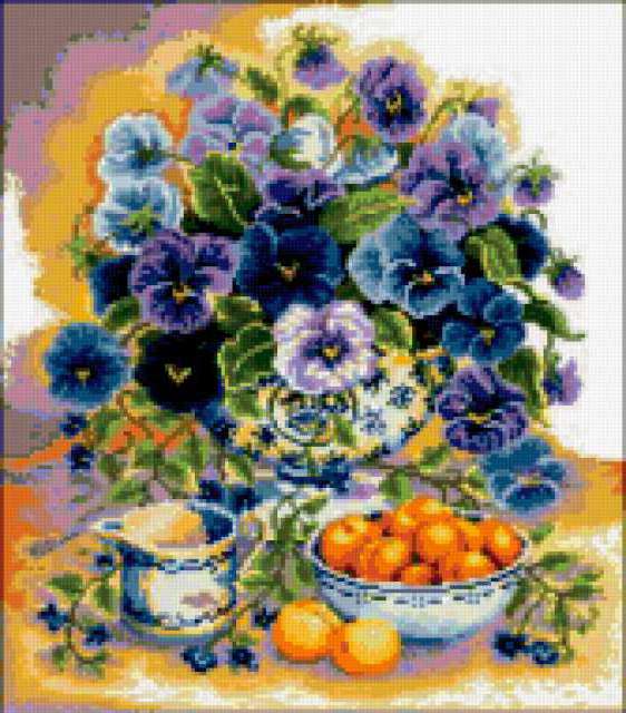 Ориентировочно так, схема вышивки «Натюрморт с фиалками», созданная автором xa00p3857, будет выглядеть при отшиве на канве. Размер данной вышивки равен 167x190 крестов, при этом используется 85 цветов. Ключевые слова, по которым можно найти эту схему: натюрморт, цветы, букет, фиалки, посуда, чашка, фрукты, абрикосы. Также, вы можете взглянуть на оригинальную картинку, соответствующую данной схеме вышивки.