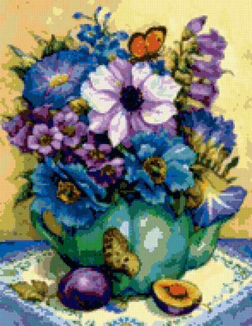 Ориентировочно так, схема вышивки «Натюрморт со сливами», созданная автором rybka6, будет выглядеть при отшиве на канве. Размер данной вышивки равен 147x190 крестов, при этом используется 48 цветов. Ключевые слова, по которым можно найти эту схему: натюрморт, цветы, слива, бабочки, колокольчик, букет, бокал, роза, чай, чашки, стол, хлеб, картина, живопись. Также, вы можете взглянуть на оригинальную картинку, соответствующую данной схеме вышивки.