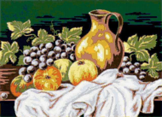 Ориентировочно так, схема вышивки «Натюрморт», созданная автором VA903M, будет выглядеть при отшиве на канве. Размер данной вышивки равен 190x137 крестов, при этом используется 55 цветов. Ключевые слова, по которым можно найти эту схему: натюрморт, картина, фрукты, кувшин. Также, вы можете взглянуть на оригинальную картинку, соответствующую данной схеме вышивки.