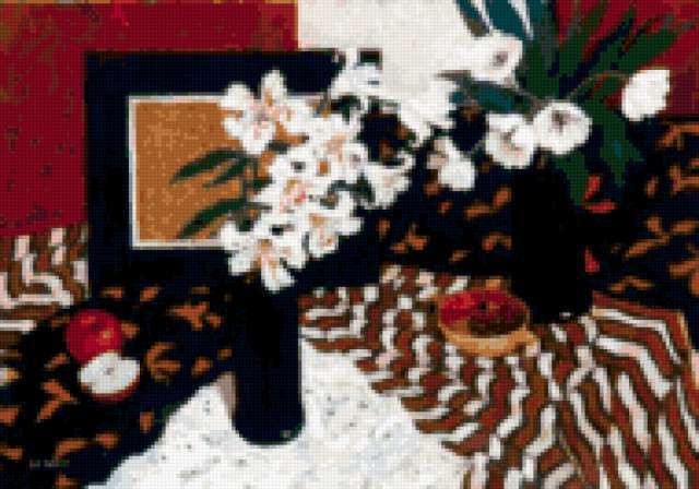 Ориентировочно так, схема вышивки «Натюрморт», созданная автором Cadykova, будет выглядеть при отшиве на канве. Размер данной вышивки равен 190x133 крестов, при этом используется 63 цветов. Ключевые слова, по которым можно найти эту схему: натюрморт, цветы, тюльпаны, лилии, ваза, картина, фрукты, яблоки. Также, вы можете взглянуть на оригинальную картинку, соответствующую данной схеме вышивки.