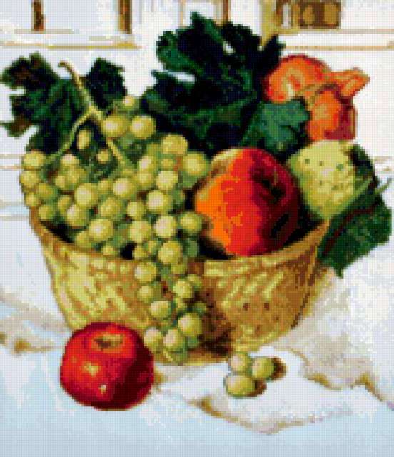 Ориентировочно так, схема вышивки «Натюрморт», созданная автором xa00p3857, будет выглядеть при отшиве на канве. Размер данной вышивки равен 164x190 крестов, при этом используется 80 цветов. Ключевые слова, по которым можно найти эту схему: натюрморт, корзина, фрукты, виноград, яблоки. Также, вы можете взглянуть на оригинальную картинку, соответствующую данной схеме вышивки.