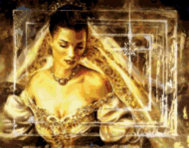 Ориентировочно так, схема вышивки «Невеста», созданная автором alena4, будет выглядеть при отшиве на канве. Размер данной вышивки равен 190x149 крестов, при этом используется 74 цветов. Ключевые слова, по которым можно найти эту схему: невеста, девушка, женщина, красавица, свадьба. Также, вы можете взглянуть на оригинальную картинку, соответствующую данной схеме вышивки.