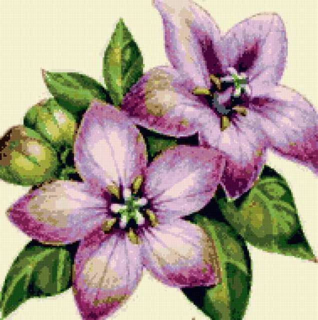 Ориентировочно так, схема вышивки «Нежные цветы», созданная автором rybka6, будет выглядеть при отшиве на канве. Размер данной вышивки равен 189x190 крестов, при этом используется 37 цветов. Ключевые слова, по которым можно найти эту схему: цветы, растения, лепестки, флора, цветок, сиреневый. Также, вы можете взглянуть на оригинальную картинку, соответствующую данной схеме вышивки.