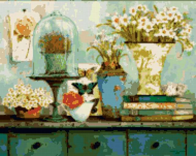 Ориентировочно так, схема вышивки «Нежный натюрморт», созданная автором poltanya, будет выглядеть при отшиве на канве. Размер данной вышивки равен 190x151 крестов, при этом используется 41 цветов. Ключевые слова, по которым можно найти эту схему: натюрморт, натюрморты, цветы, посуда, картина, искусство, красота. Также, вы можете взглянуть на оригинальную картинку, соответствующую данной схеме вышивки.