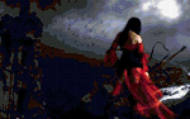 Ориентировочно так, схема вышивки «Непобедимая», созданная автором Black_Violet_, будет выглядеть при отшиве на канве. Размер данной вышивки равен 150x94 крестов, при этом используется 54 цветов. Ключевые слова, по которым можно найти эту схему: девушка, готика. Также, вы можете взглянуть на оригинальную картинку, соответствующую данной схеме вышивки.