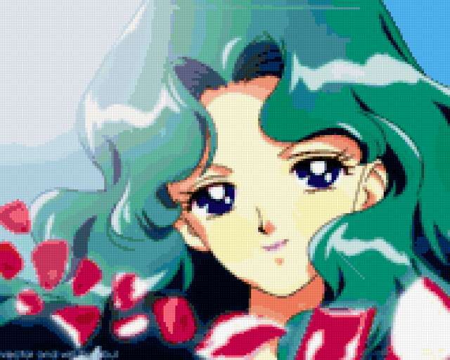 Ориентировочно так, схема вышивки «Нептун», созданная автором ImprobusDea, будет выглядеть при отшиве на канве. Размер данной вышивки равен 190x152 крестов, при этом используется 71 цветов. Ключевые слова, по которым можно найти эту схему: сейлор мун, аниме. Также, вы можете взглянуть на оригинальную картинку, соответствующую данной схеме вышивки.