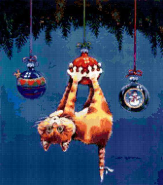 Ориентировочно так, схема вышивки «Новогодний кот», созданная автором Karel, будет выглядеть при отшиве на канве. Размер данной вышивки равен 168x190 крестов, при этом используется 62 цветов. Ключевые слова, по которым можно найти эту схему: кот, украшения, новый год, шарики, животное, зверь. Также, вы можете взглянуть на оригинальную картинку, соответствующую данной схеме вышивки.
