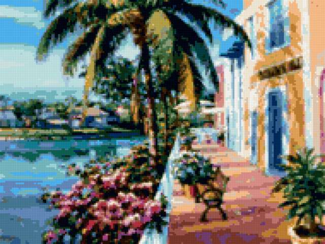 Ориентировочно так, схема вышивки «Нoward Вehrens», созданная автором malkinaiv, будет выглядеть при отшиве на канве. Размер данной вышивки равен 190x143 крестов, при этом используется 50 цветов. Ключевые слова, по которым можно найти эту схему: артина, пейзаж, море, набережная, цветы, дома. Также, вы можете взглянуть на оригинальную картинку, соответствующую данной схеме вышивки.