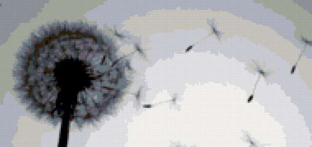 Ориентировочно так, схема вышивки «Одуванчик в полете», созданная автором irina-K, будет выглядеть при отшиве на канве. Размер данной вышивки равен 190x90 крестов, при этом используется 16 цветов. Ключевые слова, по которым можно найти эту схему: одуванчик. Также, вы можете взглянуть на оригинальную картинку, соответствующую данной схеме вышивки.