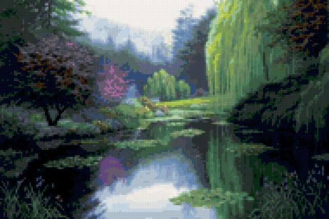 Ориентировочно так, схема вышивки «Озеро в лесу», созданная автором Svetla_Nochka, будет выглядеть при отшиве на канве. Размер данной вышивки равен 190x127 крестов, при этом используется 58 цветов. Ключевые слова, по которым можно найти эту схему: озеро, лес, природа, пейзаж, картина, река, деревья. Также, вы можете взглянуть на оригинальную картинку, соответствующую данной схеме вышивки.