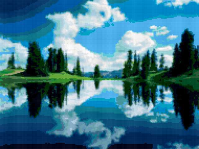 Ориентировочно так, схема вышивки «Озеро», созданная автором Filipp, будет выглядеть при отшиве на канве. Размер данной вышивки равен 190x143 крестов, при этом используется 49 цветов. К несчастью, автор не назначил для схемы ключевые слова. Также, вы можете взглянуть на оригинальную картинку, соответствующую данной схеме вышивки.