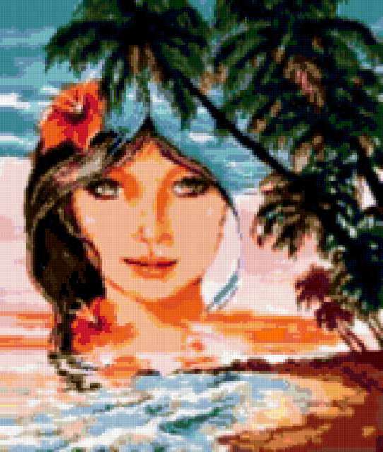 Ориентировочно так, схема вышивки «Она», созданная автором allllla, будет выглядеть при отшиве на канве. Размер данной вышивки равен 161x190 крестов, при этом используется 72 цветов. Ключевые слова, по которым можно найти эту схему: она, девушка, лицо, пейзаж, море, экзотика, девушки, портрет, женские образы, картина. Также, вы можете взглянуть на оригинальную картинку, соответствующую данной схеме вышивки.