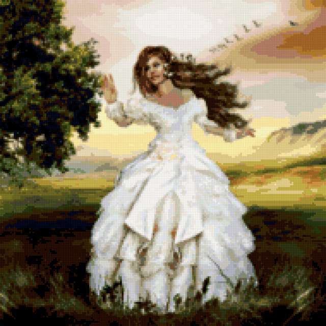 Ориентировочно так, схема вышивки «Она», созданная автором allllla, будет выглядеть при отшиве на канве. Размер данной вышивки равен 190x190 крестов, при этом используется 63 цветов. Ключевые слова, по которым можно найти эту схему: она, девушка, девушки, портрет, женские образы, картина. Также, вы можете взглянуть на оригинальную картинку, соответствующую данной схеме вышивки.