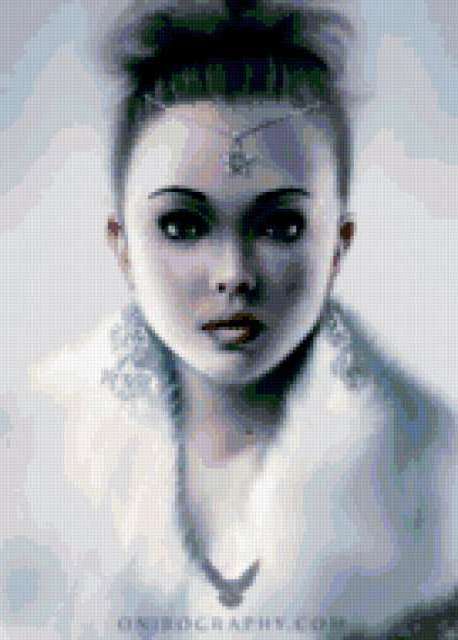Ориентировочно так, схема вышивки «Она», созданная автором allllla, будет выглядеть при отшиве на канве. Размер данной вышивки равен 136x190 крестов, при этом используется 53 цветов. Ключевые слова, по которым можно найти эту схему: девушка, девушки, портрет, женские образы, картина, гламур. Также, вы можете взглянуть на оригинальную картинку, соответствующую данной схеме вышивки.
