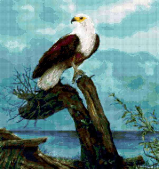 Ориентировочно так, схема вышивки «Орел», созданная автором Fardo, будет выглядеть при отшиве на канве. Размер данной вышивки равен 179x190 крестов, при этом используется 52 цветов. Ключевые слова, по которым можно найти эту схему: птица, орел. Также, вы можете взглянуть на оригинальную картинку, соответствующую данной схеме вышивки.