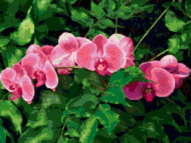 Ориентировочно так, схема вышивки «Орхидеи», созданная автором irada68, будет выглядеть при отшиве на канве. Размер данной вышивки равен 190x143 крестов, при этом используется 45 цветов. Ключевые слова, по которым можно найти эту схему: орхидеи, цветы. Также, вы можете взглянуть на оригинальную картинку, соответствующую данной схеме вышивки.