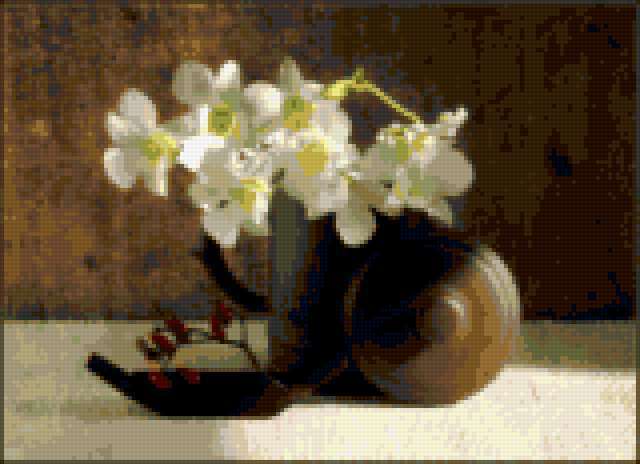 Ориентировочно так, схема вышивки «Орхидея в горшочке», созданная автором OlgaSvi, будет выглядеть при отшиве на канве. Размер данной вышивки равен 160x116 крестов, при этом используется 49 цветов. Ключевые слова, по которым можно найти эту схему: цветы, орхидеи, китай. Также, вы можете взглянуть на оригинальную картинку, соответствующую данной схеме вышивки.