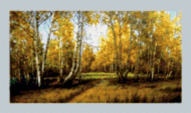 Ориентировочно так, схема вышивки «Осенний пейзаж», созданная автором lucha, будет выглядеть при отшиве на канве. Размер данной вышивки равен 190x113 крестов, при этом используется 72 цветов. Ключевые слова, по которым можно найти эту схему: осень, парк, пейзаж, природа. Также, вы можете взглянуть на оригинальную картинку, соответствующую данной схеме вышивки.