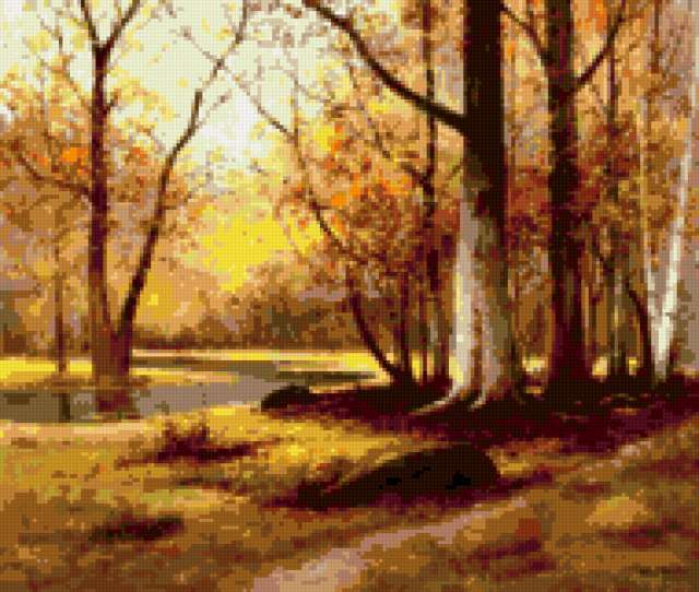 Ориентировочно так, схема вышивки «Осенний пейзаж», созданная автором poltanya, будет выглядеть при отшиве на канве. Размер данной вышивки равен 190x161 крестов, при этом используется 33 цветов. Ключевые слова, по которым можно найти эту схему: осень, осенний пейзаж, листопад, природа, картина, красота, лес, пейзаж. Также, вы можете взглянуть на оригинальную картинку, соответствующую данной схеме вышивки.