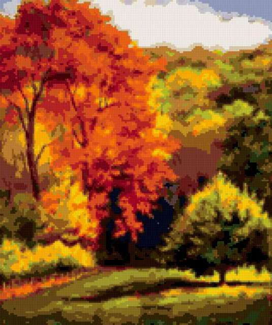 Ориентировочно так, схема вышивки «Осенний пейзаж», созданная автором poltanya, будет выглядеть при отшиве на канве. Размер данной вышивки равен 159x190 крестов, при этом используется 32 цветов. Ключевые слова, по которым можно найти эту схему: осенняя картина, осень, природа, пейзаж, лес, красота природы, живопись. Также, вы можете взглянуть на оригинальную картинку, соответствующую данной схеме вышивки.
