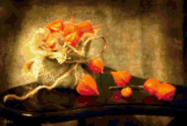Ориентировочно так, схема вышивки «Осень в мешочке», созданная автором tugova, будет выглядеть при отшиве на канве. Размер данной вышивки равен 190x128 крестов, при этом используется 63 цветов. Ключевые слова, по которым можно найти эту схему: натюрморт. Также, вы можете взглянуть на оригинальную картинку, соответствующую данной схеме вышивки.