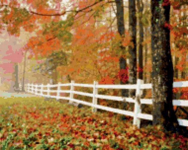 Ориентировочно так, схема вышивки «Осень в парке», созданная автором 1970, будет выглядеть при отшиве на канве. Размер данной вышивки равен 190x152 крестов, при этом используется 64 цветов. Ключевые слова, по которым можно найти эту схему: осень, природа. Также, вы можете взглянуть на оригинальную картинку, соответствующую данной схеме вышивки.
