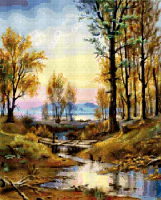 Ориентировочно так, схема вышивки «Осень золотая», созданная автором Aliko, будет выглядеть при отшиве на канве. Размер данной вышивки равен 153x190 крестов, при этом используется 87 цветов. Ключевые слова, по которым можно найти эту схему: осень, времена года, пейзаж, природа, лес, река, березы. Также, вы можете взглянуть на оригинальную картинку, соответствующую данной схеме вышивки.