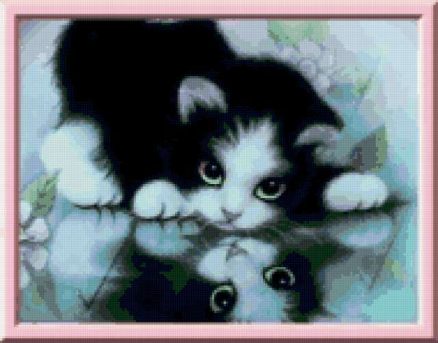 Ориентировочно так, схема вышивки «Отражение», созданная автором uzistka, будет выглядеть при отшиве на канве. Размер данной вышивки равен 190x149 крестов, при этом используется 60 цветов. Ключевые слова, по которым можно найти эту схему: кошки, котята, котятки, котенок, отражение, зеркало. Также, вы можете взглянуть на оригинальную картинку, соответствующую данной схеме вышивки.