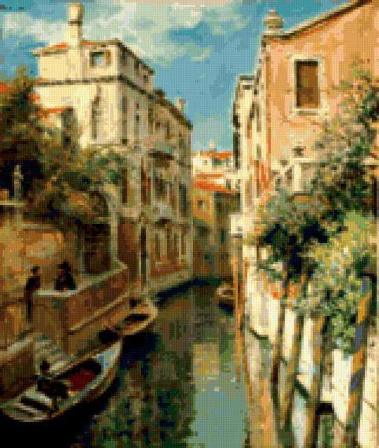 Ориентировочно так, схема вышивки «ПЕЙЗАЖ», созданная автором Elena_, будет выглядеть при отшиве на канве. Размер данной вышивки равен 161x190 крестов, при этом используется 82 цветов. Ключевые слова, по которым можно найти эту схему: пейзаж, город, венеция, канал, улица, лодка. Также, вы можете взглянуть на оригинальную картинку, соответствующую данной схеме вышивки.