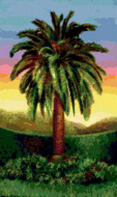 Ориентировочно так, схема вышивки «Пальма 3», созданная автором eldi_22, будет выглядеть при отшиве на канве. Размер данной вышивки равен 113x190 крестов, при этом используется 58 цветов. Ключевые слова, по которым можно найти эту схему: пальма, дерево, картина, живопись. Также, вы можете взглянуть на оригинальную картинку, соответствующую данной схеме вышивки.