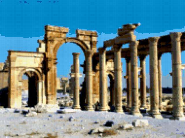 Ориентировочно так, схема вышивки «Пальмира», созданная автором VA903M, будет выглядеть при отшиве на канве. Размер данной вышивки равен 190x142 крестов, при этом используется 68 цветов. Ключевые слова, по которым можно найти эту схему: город, руины, восток. Также, вы можете взглянуть на оригинальную картинку, соответствующую данной схеме вышивки.