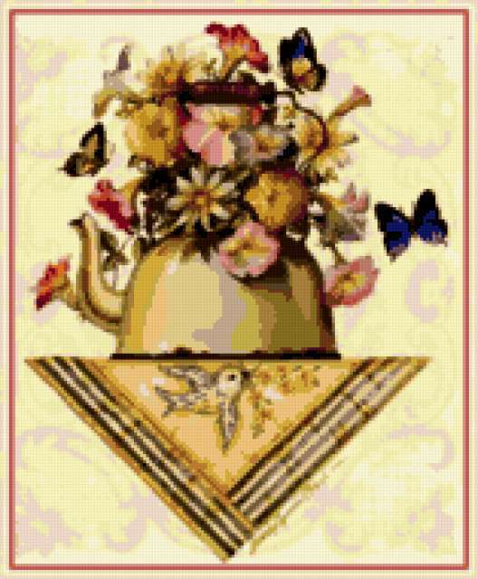 Ориентировочно так, схема вышивки «Панно на кухню», созданная автором poltanya, будет выглядеть при отшиве на канве. Размер данной вышивки равен 157x190 крестов, при этом используется 31 цветов. Ключевые слова, по которым можно найти эту схему: чайник, цветы, украшения для кухни, картина, панно, кухня, посуда, красота. Также, вы можете взглянуть на оригинальную картинку, соответствующую данной схеме вышивки.
