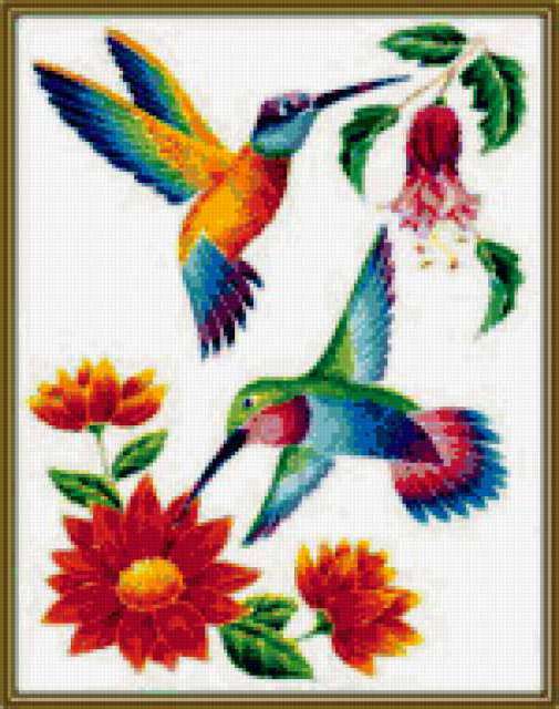 Ориентировочно так, схема вышивки «Пара», созданная автором Cadykova, будет выглядеть при отшиве на канве. Размер данной вышивки равен 150x190 крестов, при этом используется 77 цветов. Ключевые слова, по которым можно найти эту схему: пара, двое, птицы, цветы, красный, гербера, фуксия. Также, вы можете взглянуть на оригинальную картинку, соответствующую данной схеме вышивки.