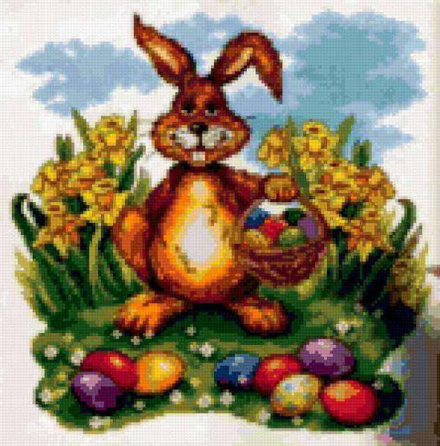 Ориентировочно так, схема вышивки «Пасха 6», созданная автором belal14, будет выглядеть при отшиве на канве. Размер данной вышивки равен 148x150 крестов, при этом используется 71 цветов. Ключевые слова, по которым можно найти эту схему: пасха, зайчик, кролик, яйца, детская, картинка, подушка. Также, вы можете взглянуть на оригинальную картинку, соответствующую данной схеме вышивки.