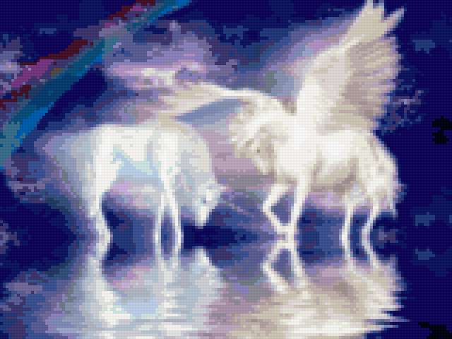 Ориентировочно так, схема вышивки «Пегас», созданная автором lilya0505, будет выглядеть при отшиве на канве. Размер данной вышивки равен 160x120 крестов, при этом используется 51 цветов. К несчастью, автор не назначил для схемы ключевые слова. Также, вы можете взглянуть на оригинальную картинку, соответствующую данной схеме вышивки.