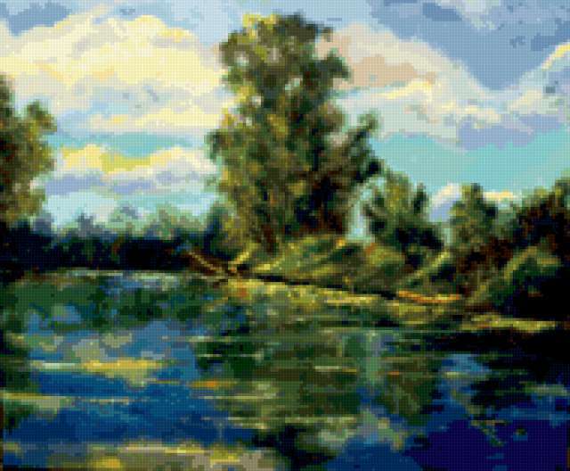 Ориентировочно так, схема вышивки «Пейзаж», созданная автором Galina-shahti-13, будет выглядеть при отшиве на канве. Размер данной вышивки равен 190x157 крестов, при этом используется 70 цветов. Ключевые слова, по которым можно найти эту схему: пейзаж. Также, вы можете взглянуть на оригинальную картинку, соответствующую данной схеме вышивки.