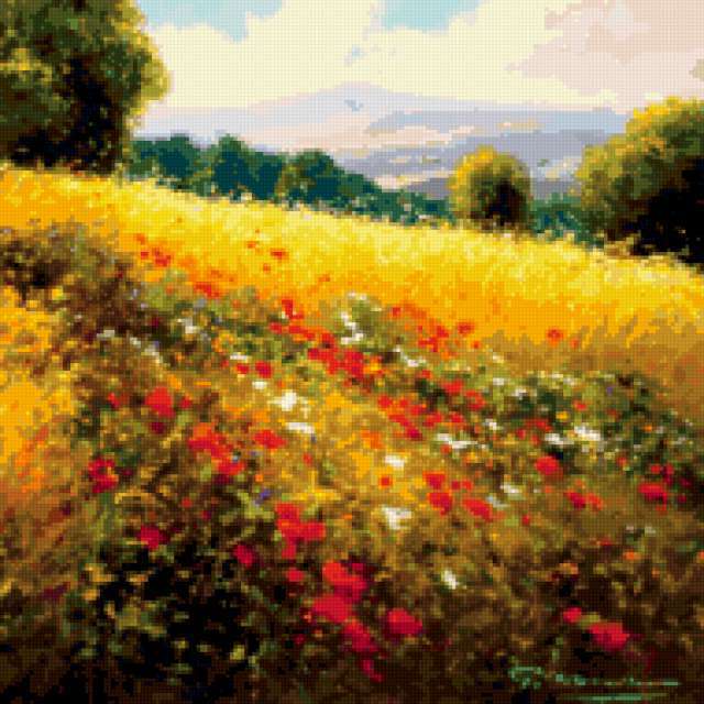 Ориентировочно так, схема вышивки «Пейзаж», созданная автором Elena_, будет выглядеть при отшиве на канве. Размер данной вышивки равен 190x190 крестов, при этом используется 71 цветов. Ключевые слова, по которым можно найти эту схему: пейзаж, поле, маки. Также, вы можете взглянуть на оригинальную картинку, соответствующую данной схеме вышивки.