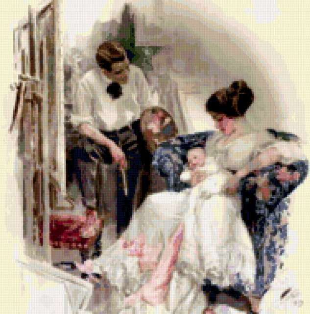 Ориентировочно так, схема вышивки «Первый портрет», созданная автором Fardo, будет выглядеть при отшиве на канве. Размер данной вышивки равен 188x190 крестов, при этом используется 73 цветов. Ключевые слова, по которым можно найти эту схему: женщина, леди, дама, х.фишер. Также, вы можете взглянуть на оригинальную картинку, соответствующую данной схеме вышивки.