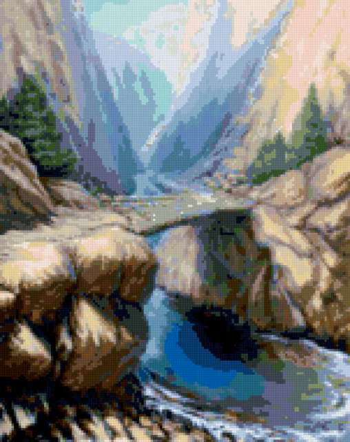 Ориентировочно так, схема вышивки «Перевал», созданная автором Svetlisha, будет выглядеть при отшиве на канве. Размер данной вышивки равен 151x190 крестов, при этом используется 53 цветов. Ключевые слова, по которым можно найти эту схему: пейзаж, река, горы. Также, вы можете взглянуть на оригинальную картинку, соответствующую данной схеме вышивки.