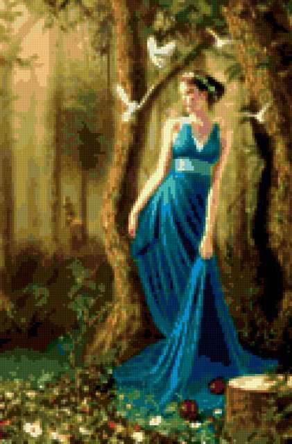 Ориентировочно так, схема вышивки «Персефона богиня царства мертвы», созданная автором Nadena_love, будет выглядеть при отшиве на канве. Размер данной вышивки равен 125x190 крестов, при этом используется 57 цветов. К несчастью, автор не назначил для схемы ключевые слова. Также, вы можете взглянуть на оригинальную картинку, соответствующую данной схеме вышивки.